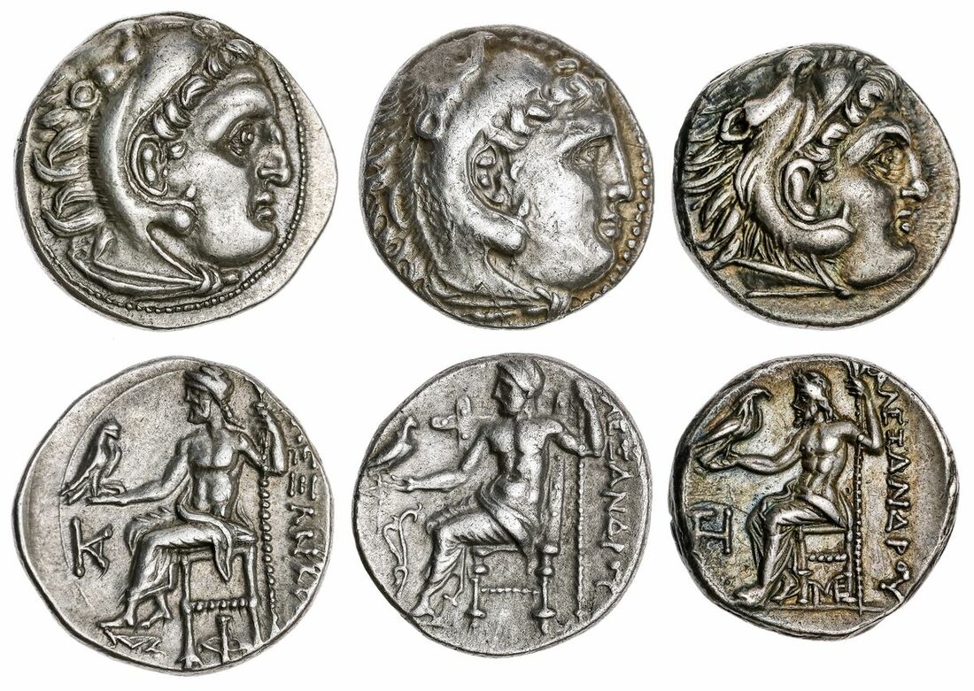 The 'Kyrios' Collection | Kingdom of Macedon, Alexander III, 'The Great' (336 - 323 BC) A selection of Drachmae (3): i) AR Drachm, Kolophon c. 306-301 BC struck under Antigonos I Monopthalamos (306-301 BC), Head of Herakles right, clad in lion's skin rev. ALEXANDROY Zeus Aetophoros holding vertical sceptre in left hand, Phi below throne, monogram in left field, 4.11g (Price 1823) lustrous, good detail, extremely fine ; ii) AR Drachm, Lampsakos c. 306-301 BC struck under Antigonos I Monopthalamos (306-301 BC), Head of Herakles right, clad in lion's skin rev. ALEXANDROY Zeus Aetophoros holding vertical sceptre in left hand, monogram below throne and in left field, 4.26g (Price 1413) toned, residually lustrous, highly detailed, near extremely fine; iii) AR Drachm, uncertain mint in Macedon or Greece, Head of Herakles right, clad in lion's skin rev. ALEXANDROY Zeus Aetophoros holding vertical sceptre in left hand, aplustre left field, 4.25g (Price 862A) lustrous, well centred, very fine