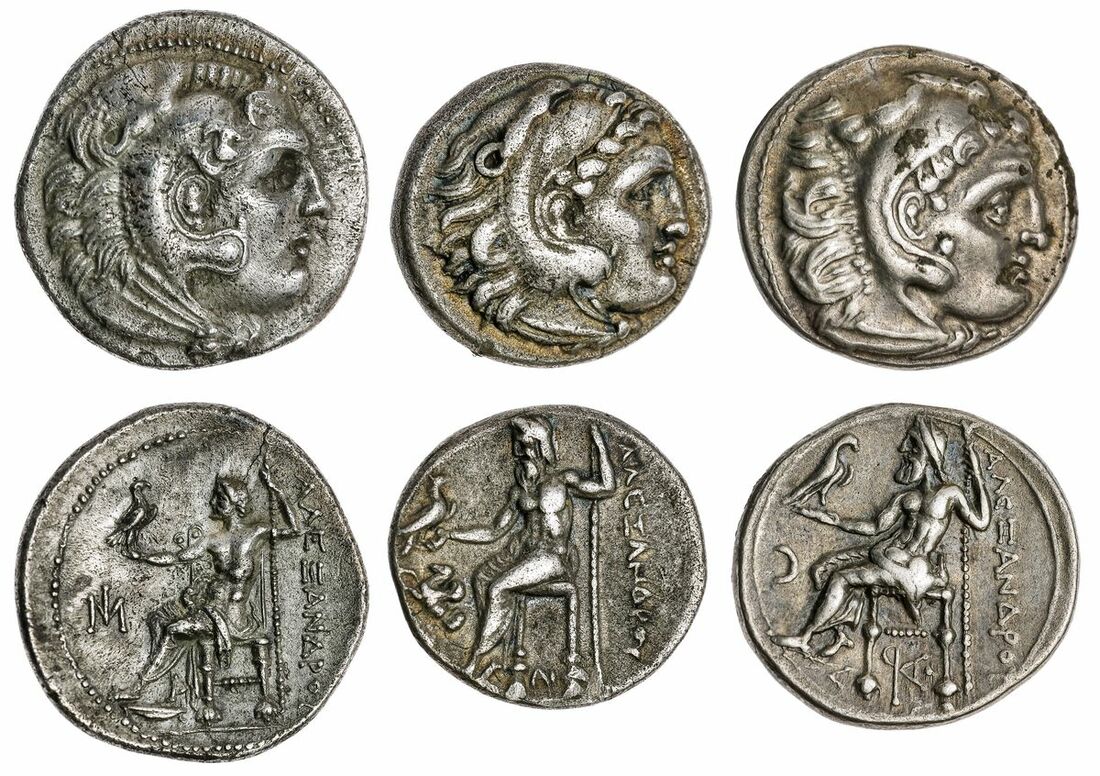The 'Kyrios' Collection | Kingdom of Macedon, Alexander III, 'The Great' (336 - 323 BC), A selection of Drachmae (3): i) AR Drachm, Colophon c. 310-301 BC struck under Antigonos I Monopthalamos (306-301 BC), Head of Herakles right, clad in lion's skin rev. ALEXANDROY Zeus Aetophoros holding vertical sceptre in left hand, monogram below throne, crescent in left field, 4.31g (Price 1827) well-centred strike, lighty toned with great detail especially on the reverse, good very fine; ii) AR Drachm, Lampsacus c. 306-301 BC struck under Antigonos I Monopthalamos (306-301 BC), Head of Herakles right, clad in lion's skin rev. ALEXANDROY Zeus Aetophoros holding vertical sceptre in left hand, monogram below throne, forepart of Pegasus in left field, 4.11g (Price 1382) well centred, slighly porus and toned, very fine; iii) AR Drachm, Miletus c. 295-270 BC, Head of Herakles right, clad in lion's skin rev. ALEXANDROY Zeus Aetophoros holding vertical sceptre in left hand, monogram in left field, 4.05g (Price 2151) slightly porus with a patchy tone (3)