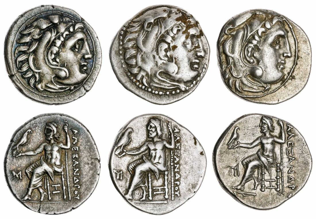 The 'Kyrios' Collection | Kingdom of Macedon, Alexander III, 'The Great' (336-323 BC) A Selection of Drachmae (3): i) AR Drachm, Abydos, Head of Herakles right, clad in lion's skin rev. ALEXANDROY Zeus Aetophoros holding vertical sceptre in left hand, monogram below throne, monogram in left field, 4.28g (Price 1528) lustrous, nicely toned, slightly off centre strike, extremely fine; ii) AR Drachm, Abydos, Head of Herakles right, clad in lion's skin rev. ALEXANDROY Zeus Aetophoros holding vertical sceptre in left hand, monogram below throne, monogram in left field, 4.28g (Price 1528) dark tone, well centred strike, good very fine; iii) AR Drachm, Abydos, Head of Herakles right, clad in lion's skin rev. ALEXANDROY Zeus Aetophoros holding vertical sceptre in left hand, monogram below throne, monogram in left field, 4.28g (Price 1528) lustorus with some softening, well centred near very fine (3)
