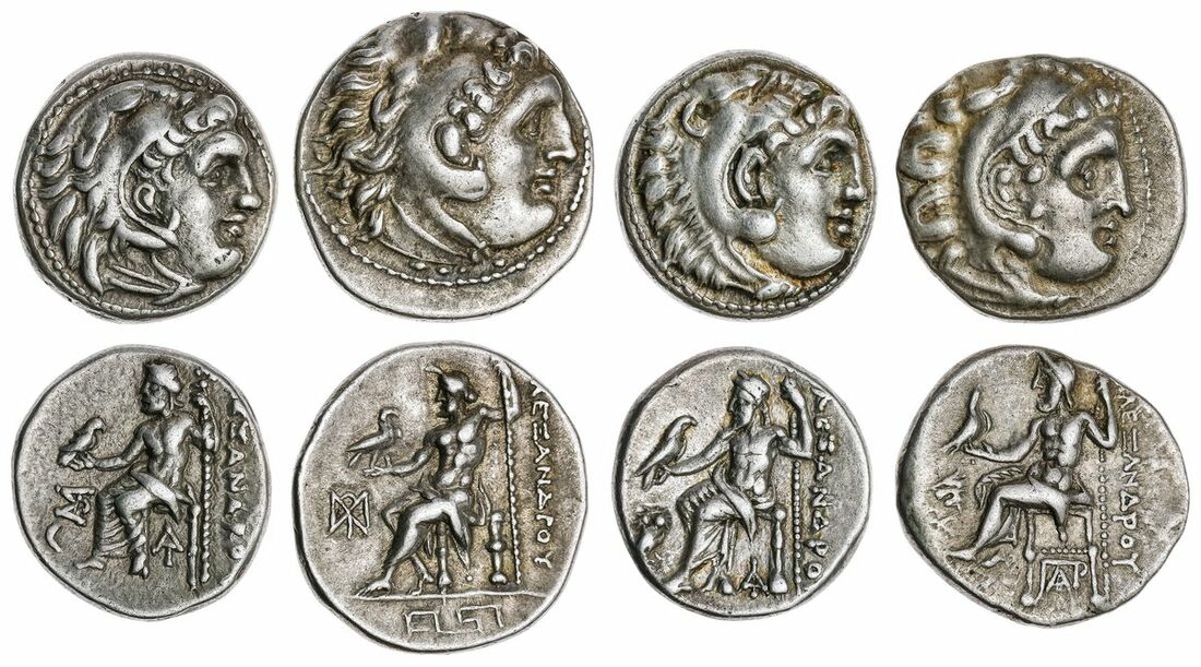 The 'Kyrios' Collection | Kingdom of Macedon, Alexander III 'The Great' (336 - 323 BC) A Selection of Drachmae (4): i) AR Drachm, Magnesia ad Meandrum c.319-305 BC, Head of Herakles right, clad in lion's skin rev. ALEXANDROY Zeus Aetophoros holding vertical sceptre in left hand, monogram below throne, owl in left field, 4.17g (Price 1965) well centred, lighly toned, very fine; ii) AR Drachm, Magnesia ad Meandrum c. 319-305 BC, Head of Herakles right, clad in lion's skin rev. ALEXANDROY Zeus Aetophoros holding vertical sceptre in left hand, monogram below throne, monograms in left field, 4.33g (Price 1570) well centred strike, lustrous, very fine; iii) AR Drachm, Magnesia ad Meandrum c.282-225 BC, Head of Herakles right, clad in lion's skin rev. ALEXANDROY Zeus Aetophoros holding vertical sceptre in left hand, monogram in left field, meander pattern in exergue, 4.26g (Price 2009) finely detailed and lightly toned, good very fine; iv) AR Drachm, Kolophon c. 305-301 BC struck under Antigonos I Monopthalamos (306-301 BC), Head of Herakles right, clad in lion's skin rev. ALEXANDROY Zeus Aetophoros holding vertical sceptre in left hand, monogram below throne, monogram in left field below lion head left, 4.25g (Price 1796) softening at higher points, good detail, very fine (4)
