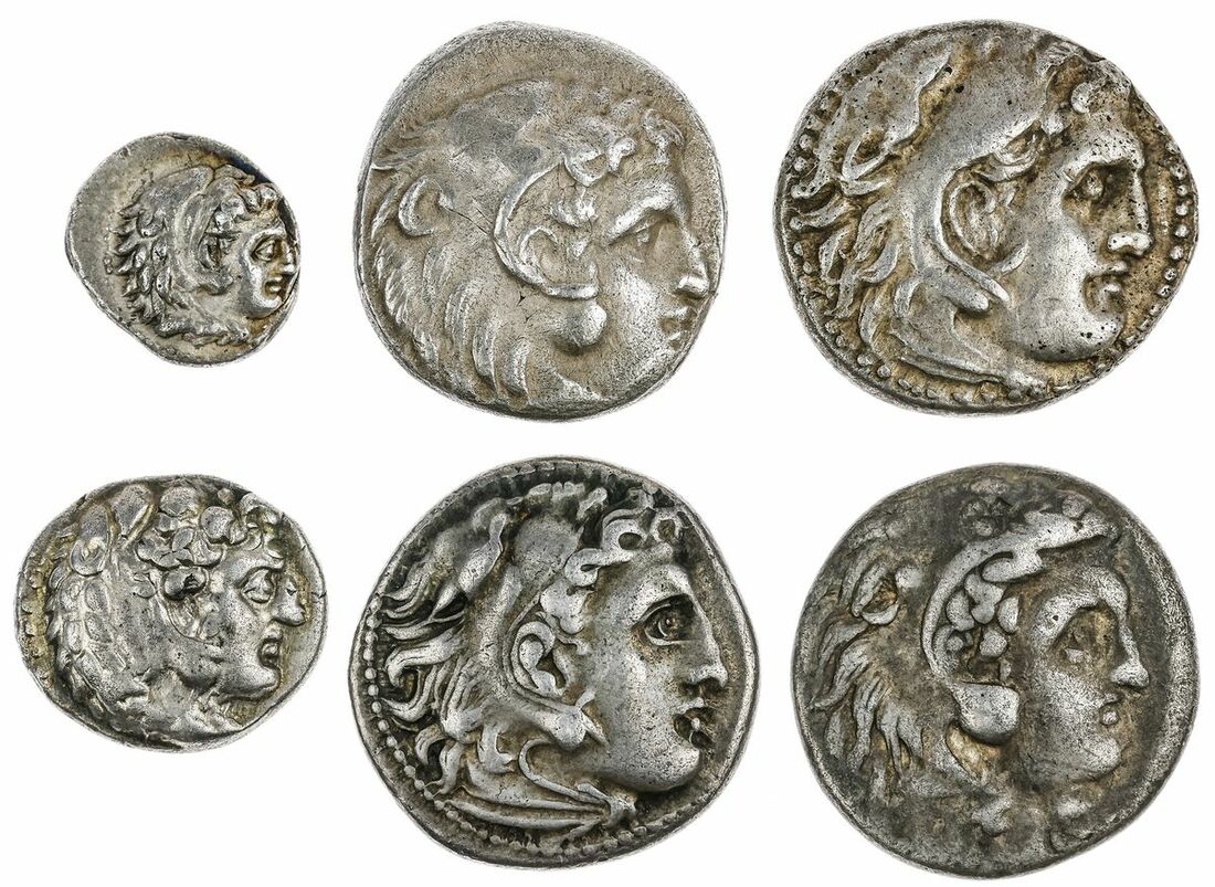 The 'Kyrios' Collection | Kingdom of Macedon, Philip III Arrhidaios (323 - 317 BC) (6): i) AR Drachm, in the name and types of Alexander III, 'The Great', Sardes mint, Struck under Menander, c.323/2BC, Head of Herakles right, wearing lion skin rev. Zeus Aetophoros enthroned left, in left field, NK monogram above torch, 4.21g, (Price, 2578) light porosity but about very fine; ii) AR Drachm, Magnesia ad Meandrum, Head of Herakles right clad in lion's skin, rev. PHILIPPOY Zeus Aetophoros holding vertical sceptre in left hand, monogram left field, 4.18g (Price P56) lightly toned, well centred, slightly porous, near very fine; iii) AR Drachm, Sardes c. 323-319 BC, Head of Herakles right, clad in lion's skin, rev. PHILIPPOY Zeus Aetophoros holding vertical sceptre in left hand, bee below throne, monogram left field, 4.12g (Price P71) toned, well centred, near very fine; iv) AR Drachm, Magnesia ad Meandrum c. 323-319 BC, Head of Herakles right, clad in lion's skin rev. PHILIPPOY Zeus Aetophoros holding vertical sceptre in left hand, thrysus in left field, 4.21g (Price P51) moderate toning with underlying lustre, near extremly fine; v) hemidrachm, Susa, with similar types, monogram below throne above strut, 1.81g (Price P210) lustrous, good detail, very fine; vi) AR obol, Susa, uncertain monogram left field, 0.68g, good detail, good very fine; (6)