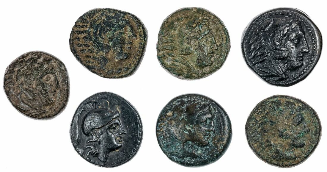 The 'Kyrios' Collection | Kingdom of Macedon, A Selection of Bronzes (7): i) Alexander III, 'The Great' (336-323 BC), AE 18, Head of Herakles right, clad in lion's skin rev. ALEXANDROY between bow and quiver above and club below, grapes in exergue, 7.77g (Price 284) richly dark patina, good detail, good very fine; ii) similar types, club above bow and quiver on the reverse and monogram at the top, 5.65g (Price 318) softening at higher points, inconsistent 'patchy' patina, good fine; iii) similar types, club above bow and quiver on the reverse, B-A across field with thunderbolt between, 4.49g good fine; iv) similar types, club above bow and quiver on the reverse, B-A across field with thunderbolt between, 4.53g green patina with some softening on the obverse, inconsistant patina on reverse, good fine; v) similar types, bow and quiver above club on the reverse, B-A across field, thunderbolt in exergue, 5.85g patchy patina, good fine; vi) similar types, bow and quiver above club on the reverse, B-A across field, 5.55g damaged green patina, fine; vii) Cassander (c.305-297 BC) AE16, helmeted head of Athena right, rev. BASILEOS KASSANDROY Bow and quiver left, club right, 4.05g (SNG Cop1159) good very fine (7)