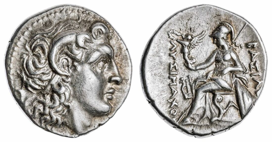 The 'Kyrios' Collection | Kingdom of Thrace, Lysimachos(323-281 BC), AR Drachm, Ephesos, c. 294-287 BC, diademed head of Alexander the Great right, wearing horn of Ammon, rev. Athena enthroned left, holding up Nike and leaning on shield, a spear resting behind, A below throne, LYSIMAXOY and a kithara in left field, BASILEOS in right field, 4.30g (Thompson 174), well centred, lustrous. good very fine