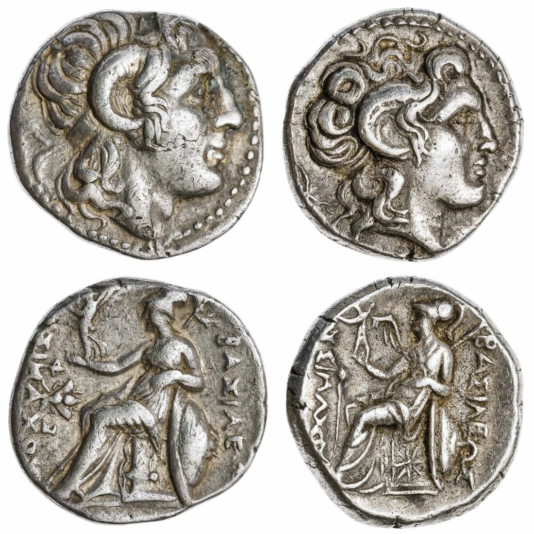 The 'Kyrios' Collection|Kingdom of Thrace, Lysimachos (323-281 BC), AR Drachm, (2): i) uncertian mint, possibly Alexandria Troas or Parion, c. 297-281 BC, diademed head of Alexander the Great right, wearing horn of Ammon, rev. Athena Nikephoros enthroned left, leaning on shield with a spear resting behind, star below throne, LYSIMAXOY and a thyrsos in left field, BASILEOS in right field, 4.80g (CNG 75, lot 118 = Freeman & Sear 13, lot 702 (same dies); Agora Auctions 5, lot 7 (same dies)) Well centred, nicely detailed, good very fine example, unrecorded in major reference works; ii) Horned head of the deified Alexander, right, rev.