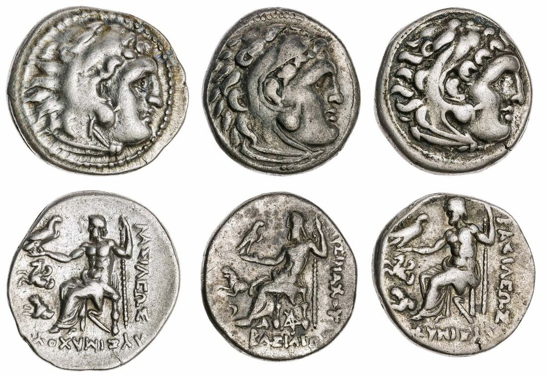 The 'Kyrios' Collection | A Trio of Lysimachan Drachmae (3): i) Kingdom of Thrace, Lysimachos (305-281 BC) AR Drachm, Lampsakos, Head of Herakles right, wearing lion skin rev. Zeus Aetophoros enthroned left, torch below throne, in left field pegasos forepart left above lion forepart left,