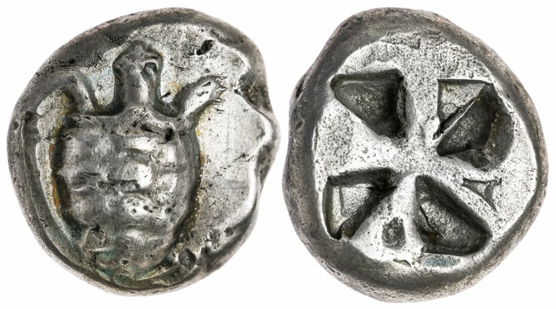 The 'Kyrios' Collection | Attica, Aegina, AR Didrachm, c. 510-405 BC, 'Land Tortoise' with roughly segmented shell pattern rev. Incuse 'mill-saw' pattern with triangular depressions and four raised segments, 12.18g (Milbank, NNM 24, pl. 1,12) Toned, a rare type slightly gouged to the edges but otherwise very fine