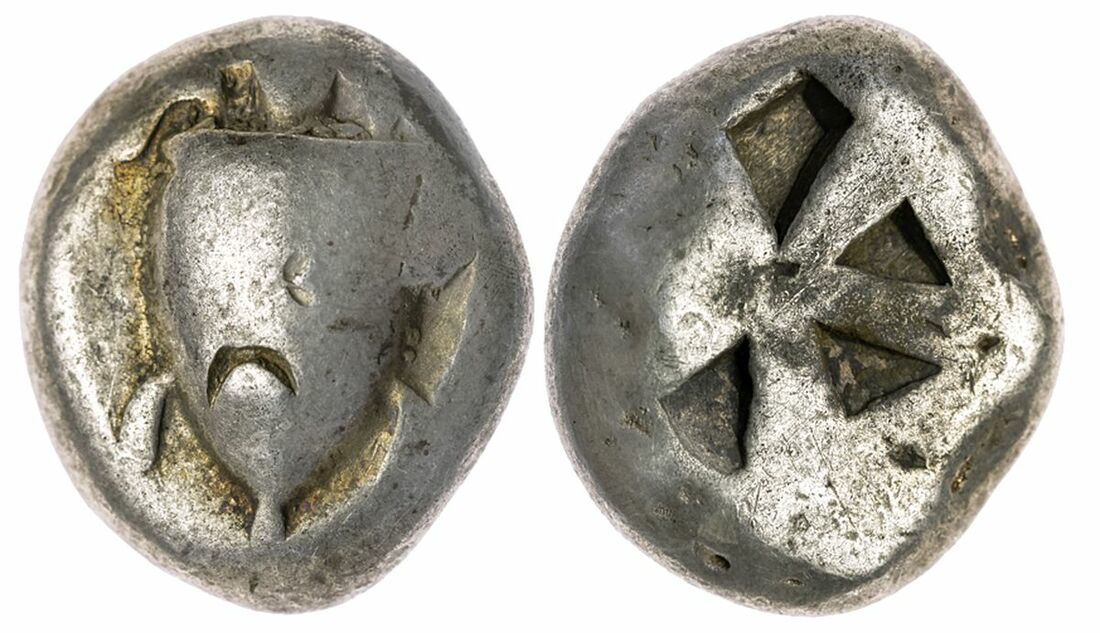 The 'Kyrios' Collection | Attica, Aegina, AR Didrachm, c. 500-490 BC, 'Sea Turtle' seen from above with smoothed back, head in profile rev. Incuse skew pattern, 12.22g (SNG Copenhagen 507) Banker's mark to obverse, smoothed to edges but otherwise good fine