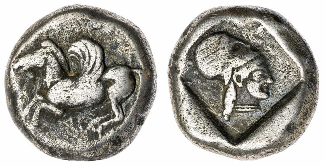 The 'Kyrios' Collection | Corinthia, Corinth AR Tridrachm, c. 515-450 BC, Pegasos with curled wing flying left, Koppa below, rev. Head of Athena right, wearing helmet, within incuse square (Ravel 129), Toned, good fine, reverse very fine