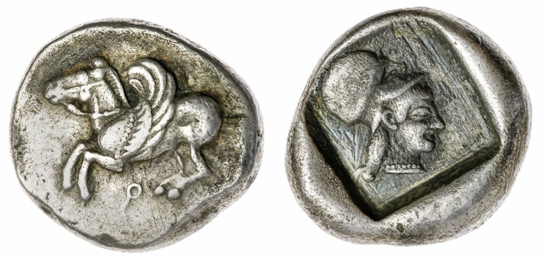 The 'Kyrios' Collection | Corinthia, Corinth AR Tridrachm, c. 500-450 BC, Pegasos with curled wing flying left, Koppa below, rev. Head of Athena right, wearing helmet, within incuse square, 8.54g (Ravel 151) Darkly toned, good very fine
