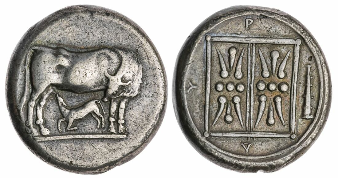 The 'Kyrios' Collection | Illyria, Dyrrhachion, AR Didrachm, c. 400 BC, Cow suckling calf, head reverted, exergual line belowrev. Alternating double-stellate floral pattern within square,