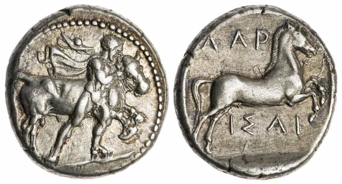 The 'Kyrios' Collection | Thessaly, Larissa, AR Drachm, c. 400-360 BC, Thessalian youth wrestling bull by the horns right, his cloak and petasos flying out behind him, rev. Horse prancing right within shallow incuse, 6.04g (BCD II, 171; Lorber 46) Toned and lustrous, nicely-struck, good very fine