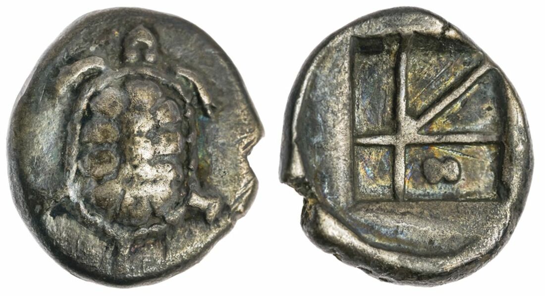 The 'Kyrios' Collection | Attica, Aegina, AR Drachm, c. 350-338 BC, 'Land Tortoise' with segmented shell pattern, head in profile rev. Incuse square divided into five compartments with two pellets in one of them, 5.09g (BMC 167) Toned and well-struck, good very fine Ex. Sotheby's, 26 September 1979, lot 57