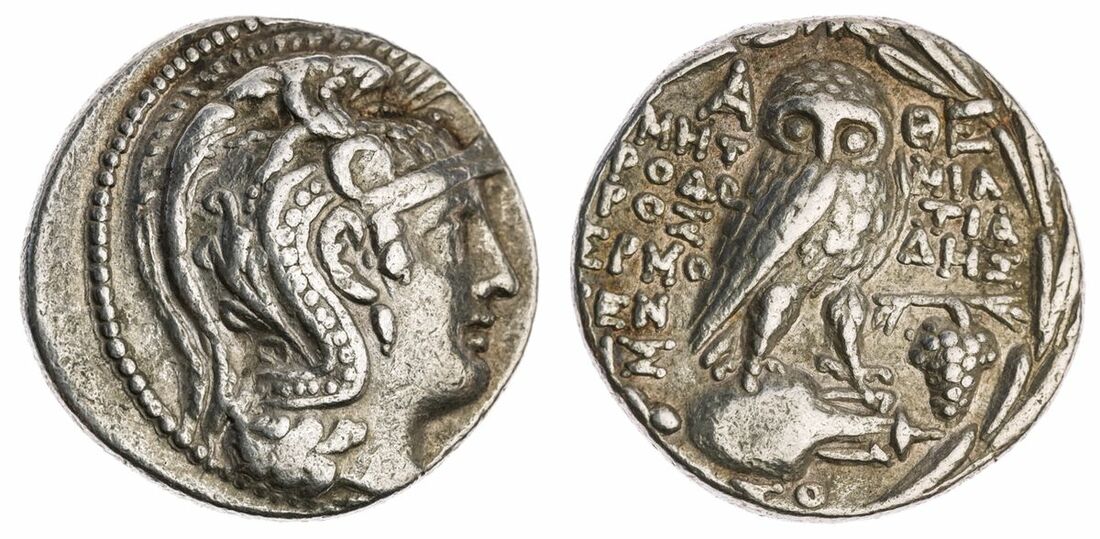 The 'Kyrios' Collection | Attica, Athens, AR Tetradrachm, 'New Style' Coinage, c. 115/114 BC, Metrodorus, Miltiades, and Ermogenes as Magistrates, Head of Athena right, wearing triple-crested Attic helmet decorated with aphlaston, Pegasus above undecorated upturned cheek flap, protomes of four horses above visor rev.