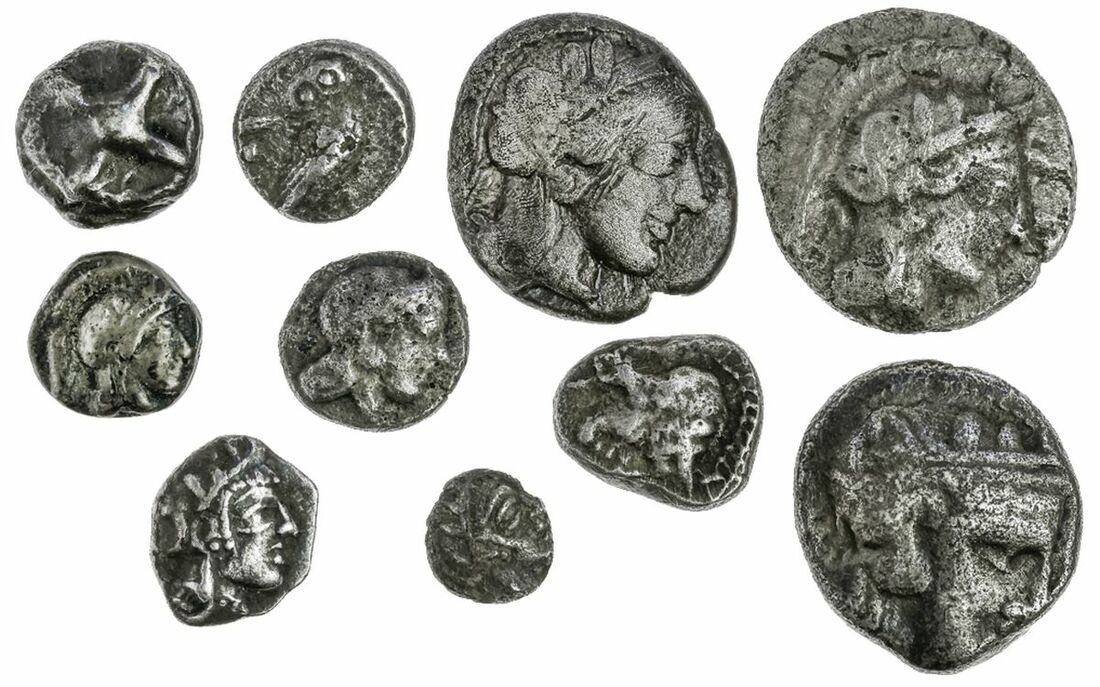 The 'Kyrios' Collection | Attica, Athens, a Selection of Small Silver (10), including Hemidrachmae (3): i) 2.00g; ii) 1.89g; iii) 2.05g, Ranging from good to good fine, (3); iv) Obol, c. 545-515 BC, 0.65g (Svoronos I, 54, 56) About very fine; Hemiobol (3): v) c. 400-300 BC, 0.38g (Svoronos 16); vi) c. 500-430 BC, 0.34g; vii) Fifth-Fourth Century BC, 0.68g (Obol?), Ranging from good fine to very fine (3); Tetartemorion (3): viii) c. 448-415 BC, 0.58g; ix) c. 393-300 BC, 0.50g (BMC 187); x) c. 390-350 BC, 0.16g; All about very fine (3); (10).