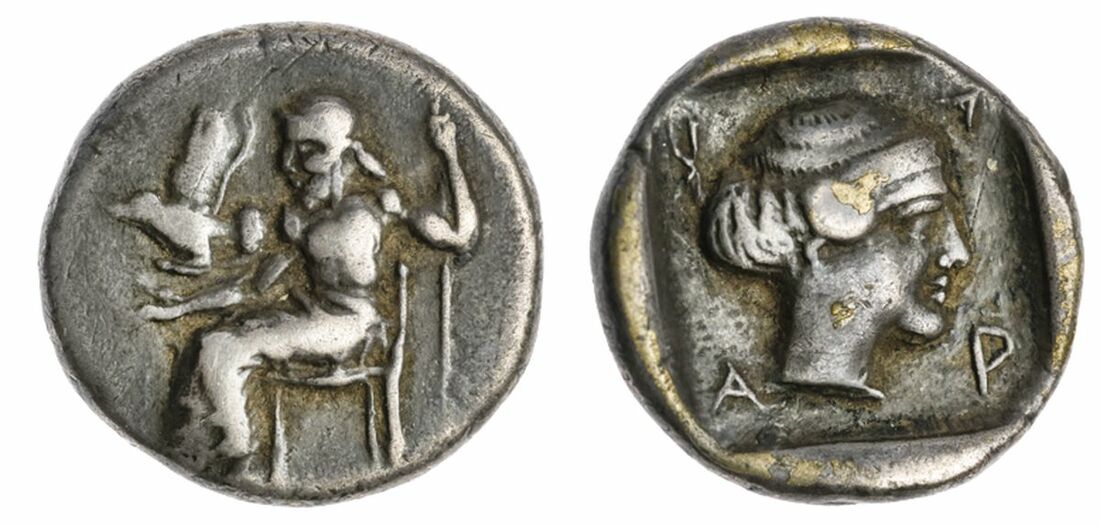 The 'Kyrios' Collection | Arcadia, Arcadian League, Mantinea, AR Hemidrachm, c. 450-440/30 BC, Zeus Lykaios seated left, holding sceptre, eagle flying left from his hand rev. Head of Kallisto right within incuse square, 2.93g, (Williams, Confederate, period IV, 291b (O194/R191 – this coin)) Nicely toned and well-struck, a lovely example of a great rarity with fantastic pedigree, very fine