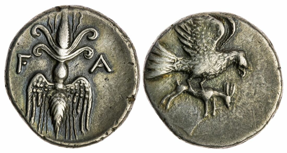 The 'Kyrios' Collection | Elis, Olympia AR Drachm, c. 244-206 BC, Eagle flying right with hare in talons, rev.