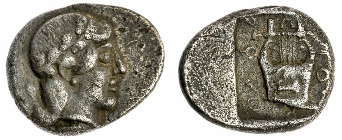 The 'Kyrios' Collection | Ionia, Kolophon, AR Drachm, c. 490-450 BC, Laureate head of Apollo right, rev. koo around lyre, all within incuse square, 5.53g (BMC 3; SNG Fitzwilliam 4404), Some porosity, very fine, reverse almost very fine, rare