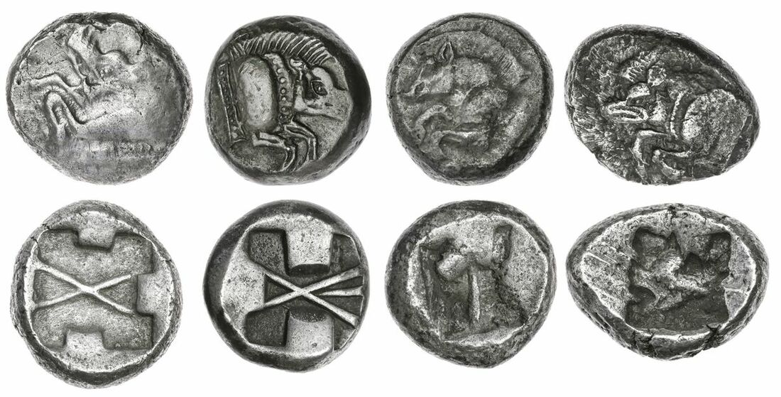 The 'Kyrios' Collection | A Group of Lycian Staters (4): i) Uncertain Dynast, AR Stater (c.520-470 BC), forepart of boar left, rev  square incuse punch, 9.68g (SNG Von Aulock 6460),  toned, near very fine; ii) Similar types with bisecting line through irregular incuse square on the reverse, 9.27g (c.f. SNG Copenhagen 2-3), good fine; iii) similar types, forepart of boar right and with crossed lines within square incuse punch on the reverse, 9.08g (SNG Von Aulock 4054), toned, near very fine; iv) similar types, boar left, crossed lines within square incuse punch on the reverse, 9.17g (c.f. SNG Von Aulock 4050),  bright, good fine (4)