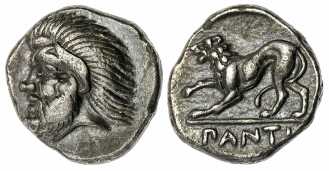 The 'Kyrios' Collection | Cimmerian Bosphorus/Tauric Chersonessos, Pantikapaion, AR Hemidrachm, c. 380-320 BC, Bearded head of Pan with goat's ear and wavy hair to left, rev. Lion prowling to left, his head raised and his tail curled round between his back legs,