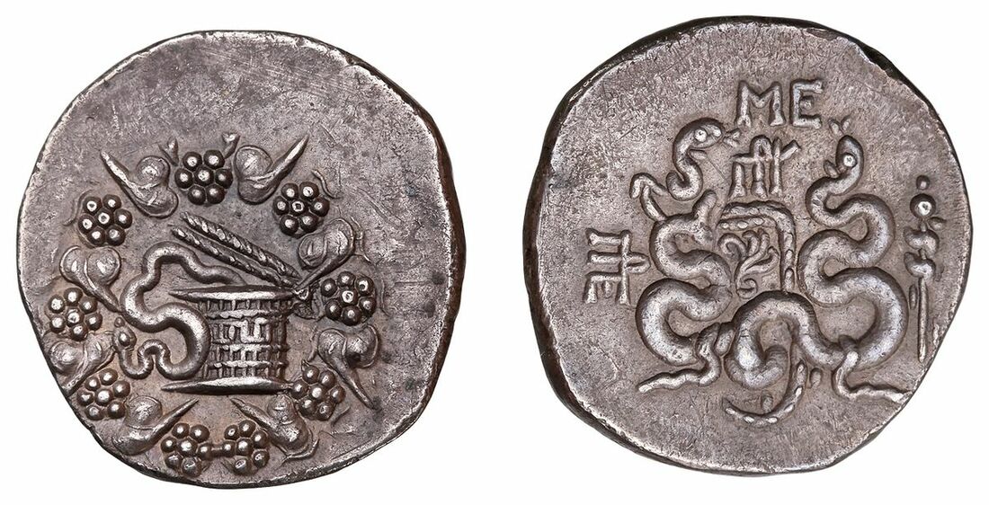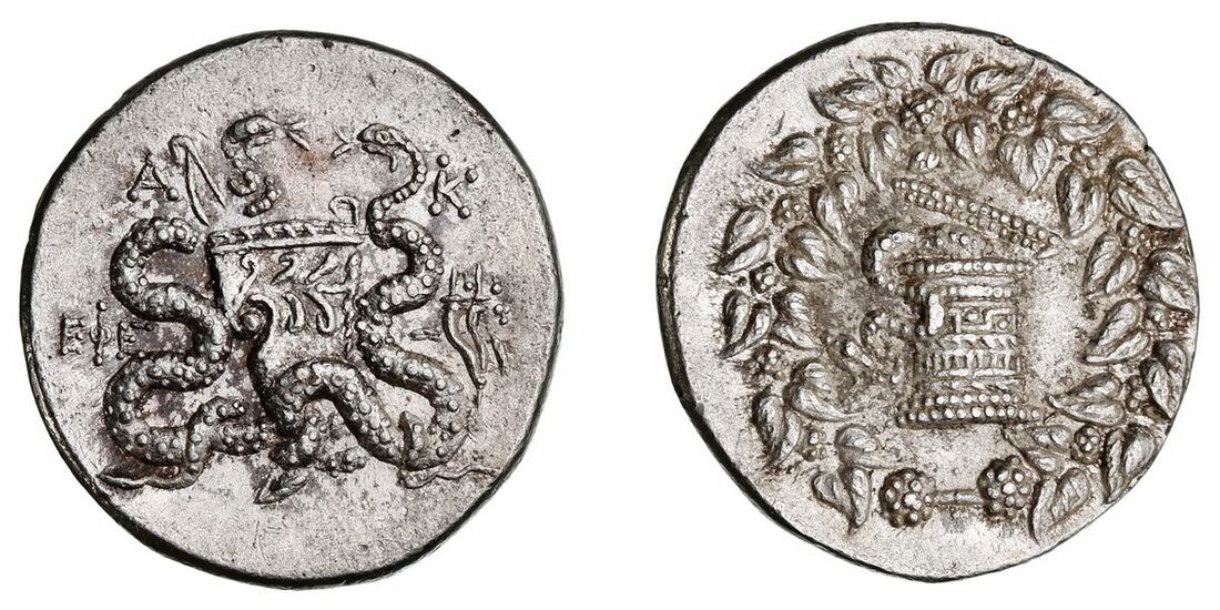 The 'Kyrios' Collection | A Pair of Cistophoric Tetradrachms (2): i) Mysia, Pergamon (after 133 BC), AR Cistophoric Tetradrachm, snake emerging from cista mystica within Dionysiac wreath, symbols around, rev. serpents around bow case, ME-A above around monogram, monogram in left field, 12.11g (SNG Copenhagen 436), nicely toned, good detail, extremely fine; ii) AR Cistophorus, snake emerging from lid of cista mystica, within ivy-wreath, rev.