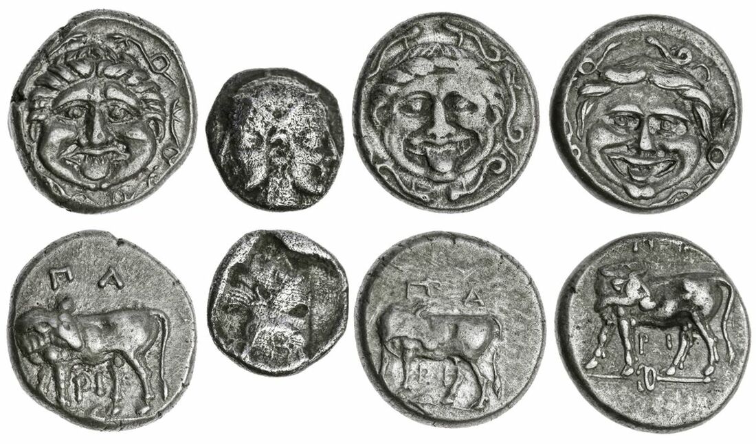 The 'Kyrios' Collection | A Selection of Mysian Silver (4): i) Lampsakos, AR Trihemiobol, c. 480-450 BC, female janiform head, rev. helmeted head of Athena left, within incuse square, helmet decorated with wheel, 0.81g (SNG BN 1128; SNG Copenhagen 186), slight porosity, good fine; Parion, AR Hemidrachmae, c.350-300 BC (3): all with cow standing left, head looking back,