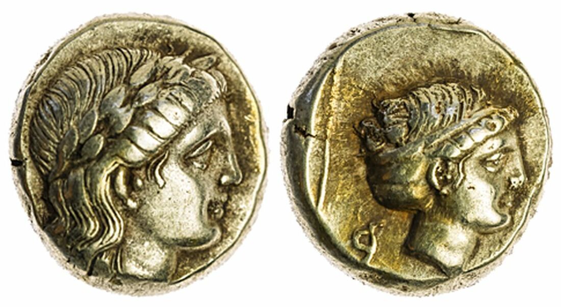 The 'Kyrios' Collection | Lesbos, Mytilene, EL Hekte, c. 377-326 BC, Laureate head of Apollo right rev. Head of Artemis right, hair in sphendone, coiled serpent right behind, in linear border surrounds, all within incuse square, 2.55g (Bodenstedt 100a; SNG von Aulock 171) Nicely-struck, residually lustrous, very fine