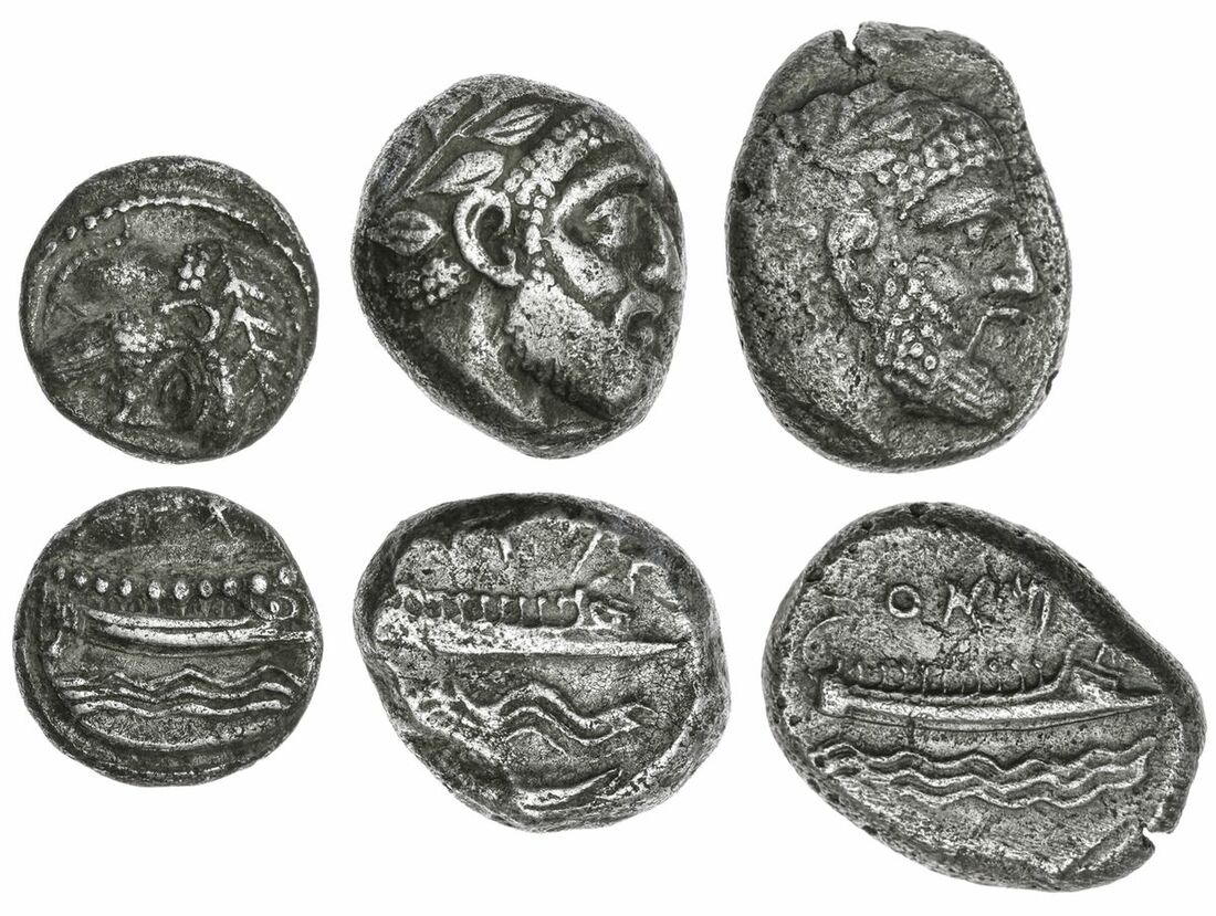 The 'Kyrios' Collection | Phoenicia, Arados (3): AR Stater (2): i) Laureate head of Baal right, rev. Galley over stylised waves, Aramaic above, 10.15g (Betlyon 26) Short flan, good fine; ii) Another, as before, 10.23g (Betlyon 29) Porous, good fine; (2); iii) 1/3 Stater, as before, 3.39g, About very fine