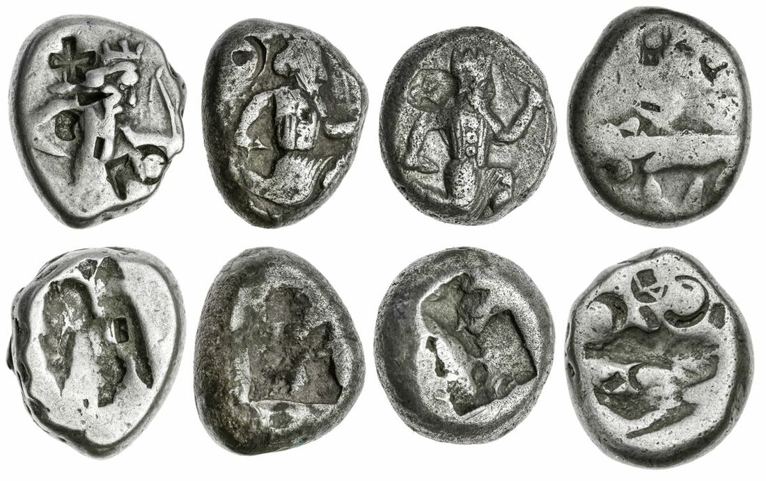 The 'Kyrios' Collection | A Selection of Persian Sigloi with Obverse Banker's Marks, (4) (515-400 BC) AR Sigloi, Sardis, All 'Bow and Dagger' type with Great-King in kneeling-running stance right, holding bow and dagger rev. Rectangular incuse punch, (4): i) 5.07g Lustrous, good fine; ii) 5.43g Slightly porous, but well-struck, near very fine; iii) 5.43g, Residually lustrous, good fine; iv) 5.23g, Softened, about good fine, (4).