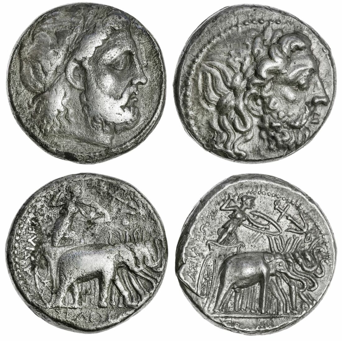 The 'Kyrios' Collection | Seleukid Kingdom of Syria, Seleukos I Nikator (312-280 BC) AR Tetradrachm (2): i) Seleukis-on-the-Tigris, c. 297-296 BC, Bearded head of Zeus right rev. Athena brandishing a spear and shield, standing right in chariot drawn by four elephants, anchor right to upper right,