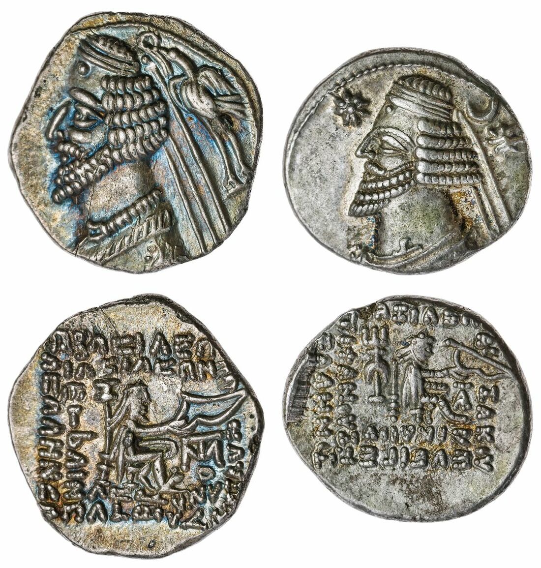 The 'Kyrios' Collection | A Pair of Parthian Drachmae (2): i) Orodes II (57-38 BC), AR Drachm, diademed head left, royal wart on forehead, between star and star and crescent, rev. Arsakes I seated right on throne, holding out bow, anchor behind, monogram before, square seven-line legend, 3.95g (Sellwood 48.9; Shore 261) about extremely fine ; ii) Phraates IV (c.38-2 BC), AR Drachm, draped and diademed bust left, royal wart on forehead, eagle behind wih wreath in beak, rev. archer seated on omphalos right, holding bo, monogram to right, square seven line legend, 3.16g (Shore 282; Sellwood 52.14), a pleasing iridesent tone large flan, extemely fine (2)