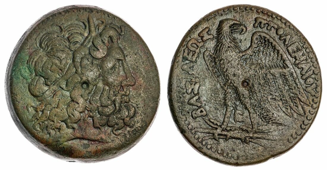 The 'Kyrios' Collection | Ptolemaic Kingdom of Egypt, Ptolemy II Philadelphos (285-246 BC) AE 44, Alexandria 266-256 BC, Head of Zeus-Ammon right wearing tainia rev. BASILEOS PTOLEMAIOY Eagle standing left on Thunderbolt, head right with wings displayed, E between legs, 93.94g (Svoronos 446; SNG Copenhagen 142) slighly patchy patina on the obverse, but with a splendid, well centred and consistent reverse, good very fine