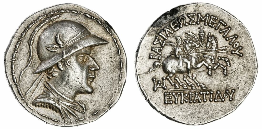 The 'Kyrios' Collection | Kingdom of Baktria, Eukratides I (c. 171-135 BC) AR Tetradrachm, Balkh, c. 160-135, Diademed, draped and cuirassed bust right, wearing crested helmet ornamented with bull's horn and ear rev.