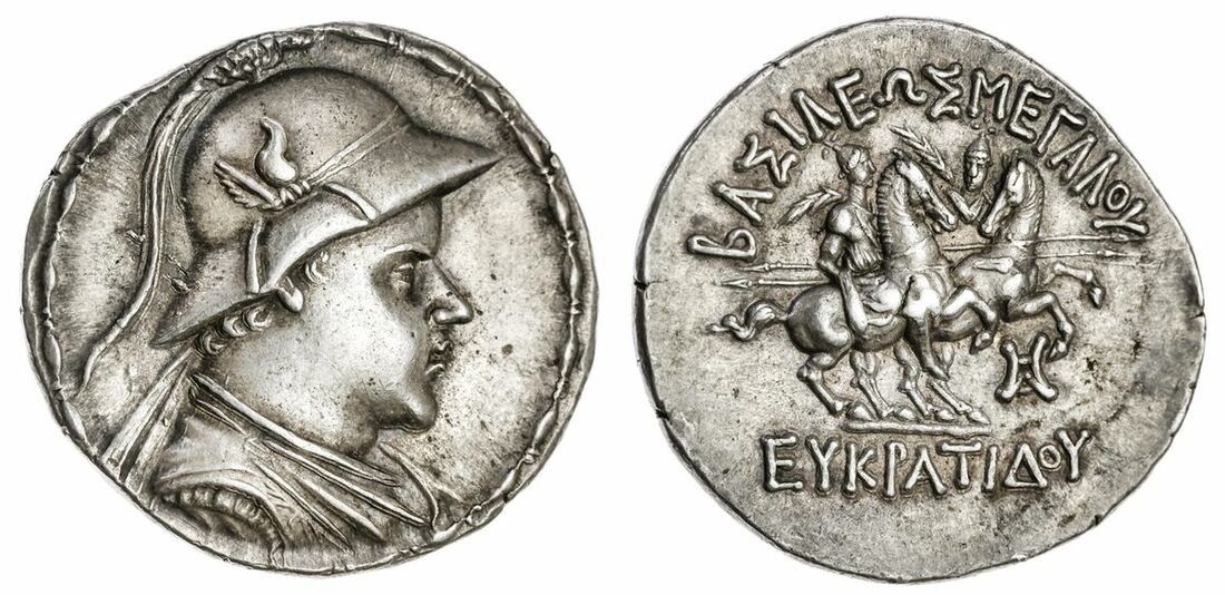 The 'Kyrios' Collection | Kingdom of Baktria, Eukratides I (c. 171-135 BC) AR Tetradrachm, Balkh, c. 160-135, Diademed, draped and cuirassed bust right, wearing crested helmet ornamented with bull's horn and ear rev.