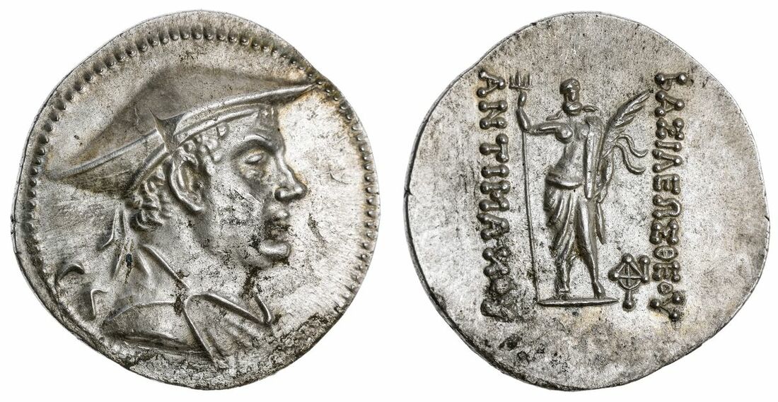 The 'Kyrios' Collection | Kingdom of Baktria, Antimachos I (c. 174-165 BC) Diademed and draped bust right, wearing kausia rev.