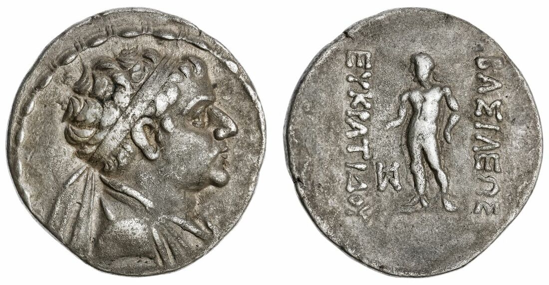 The 'Kyrios' Collection | Kingdom of Baktria, Eukratides II (c.145-140 BC), AR Tetradrachm, diademed and draped bust right rev. BASILEOS EYKRATIDOY, Apollo standing half left, holding arrow and bow, monogram in the left inner field, 16.62 (SNG ANS 619; Bib. Nat. 1H), large flan, almost very fine, reverse good fine