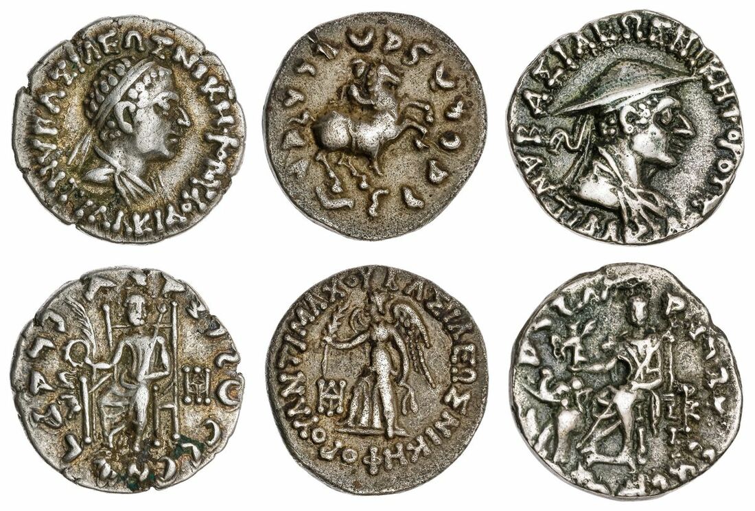 The 'Kyrios' Collection | Kingdom of Baktria, a Selection of Drachmae (3): i) Antimachus II (c.174-165 BC), AR Drachm, BASILEOS NIKEPHOROY ANTIMAXOY, Nike advancing left holing palm branch and fillet, monogram in left field, rev. Karosthi legend, helmeted king on horseback prancing right, 2.36 (Bopearachchi-Serie 1E) toned, very fine;