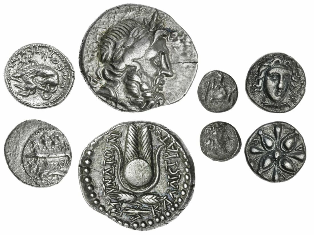 The 'Kyrios' Collection | A selection of Eastern-Mediterranean Silver (6): i) Karia, Myndos, AR Drachm, 3.69g, Laureate head of Zeus right rev. Isis headress above corn ears and thunderbolt, 3.69g (BMC 18, 134, 6) Toned, about good very fine; ii) Hidrieus (c.351-343 BC), AR Quarter-Drachm, 0.84g, laureate head of Apollo three-quarters facing right, rev. ipi, ornamental star (SNG Finland 279); iii) Caria, Euromos (c.400 BC), AR Tetartemorion, 0.23g, forepart of boar right, rev. head of Zeus right (SNG Finland 864) Good fine; iv) Cilicia, uncertain mint (c.400 BC), AR Obol, draped bust facing slightly to the left wearing Kyrbasia with star to the left, rev. draped bust of woman left wearing tainia, earing and necklace, 0.70g (Winzer 18.2) bright, very fine; v) Tarsos (384-361 BC), AR Obol, draped bust of woman right wearing earing and necklace, rev. 'trkmw' Aramaic legend, bearded head of Ares right wearing crested Attic helmet, 0.68g (SNG Paris 278-281), very fine; vi) Phoenicia, Byblos (c.350 BC), AR Sixteenth Stater, 0.80g, hoplites in galley left, hippocamp below, rev. lion attacking bull left (BMC 6), almost very fine to good very fine;