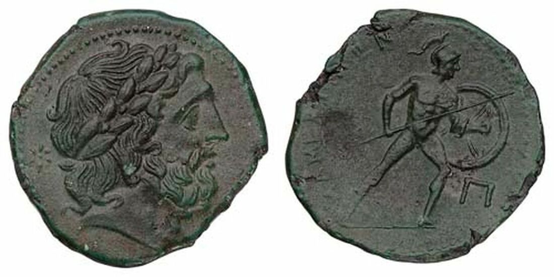 Sicily, Mamertini (late 3rd century BC), AE Pentonkion, laureate head of Zeus right, rev. MAMERTINON, helmeted, naked warrior advancing right holding spear and shield, P to right, 9.95g (SNG ANS 441), pleasing bottle-green patina, small cracks in flan, very fine