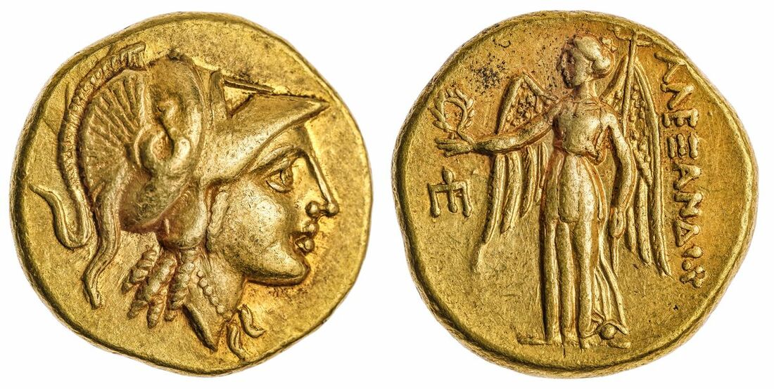 Kingdom of Macedon, Alexander III, 'The Great' (336-323 BC) AV Stater, Lampsakos, late lifetime/early posthumous issue struck under Antipater I, c. 325-319, Head of Athena right, wearing crested Corinthian helmet ornamented with a coiled serpent, with a pearl necklace rev.