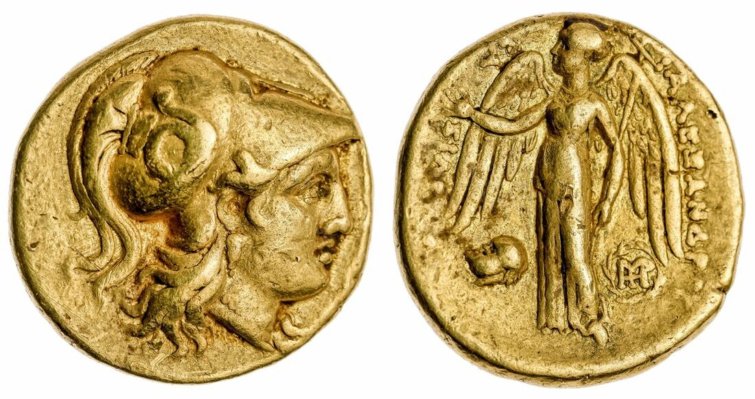 Kingdom of Macedon, Alexander III, 'The Great' (336-323 BC), posthumous issue of Babylon, under Seleukis I Nikator, c. 311-300 BC, AV Stater, head of Athena wearing pearl necklace, pendant earring and crested Corinthian helmet with two short parallel crests, ornamented with coiled snake right, hair flowing loose over left shoulder and upswept at temple, rev.