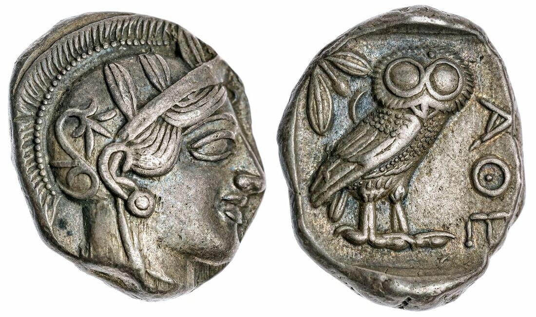 Attica, Athens AR Tetradrachm, c. 454-404 BC, head of Athena right, with frontal eye, wearing earring, necklace and crested Attic helmet decorated with three olive leaves over visor and palmette, rev. owl standing right, head facing, olive sprig and crescent to left, ATHE in right field, all within incuse square, 17.11g (Kroll 8; Dewing 1591-8; SNG Copenhagen 31), a fine specimen struck in high relief, finely detailed with minimal softening, near extremely fine
