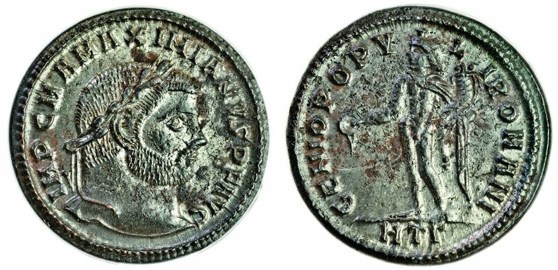 Roman Empire, Maximianus (first reign, 286-305), Follis, Hercalea, IMP C M A MAXIMIANVS PF AVG laureate, bearded head right, rev. GENIO POPVLI ROMANI, Genius standing left holding patera, HTB in exergue (RIC 19b), extensive silvering, attractive, in ANACS holder graded AU 53