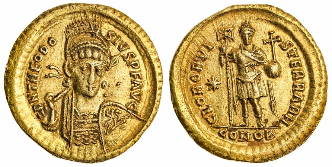 Roman Empire, Theodosius II (AD 402-450), AV Solidus, Constantinople c. AD 425-430, DN THEODOSIVS FP AVG, pearl-diademed, helmeted, and cuirassed bust of Theodosius facing slightly right, holding spear over shoulder and shield decorated with a horseman spearing a fallen enemy, rev. GLOR ORBIS TERRAR Theodosius standing facing, holding labarum and globus cruciger, star in left field, CONOB in exergue, 4.47g (Depeyrot 77/1; RIC 23), very nicely centred, detailed strike, minor deposits, near extremely fine