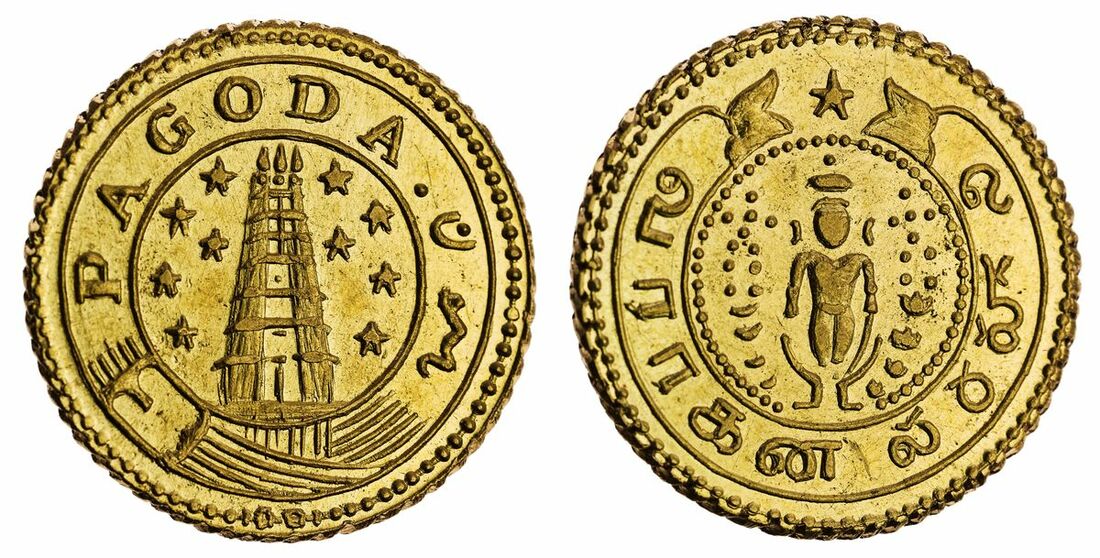 East India Company, Madras Presidency, gold Pagoda Restrike, pagoda, rev. deity standing, obliquely milled edge, 12h, 2.92g (KM 356), extremely fine