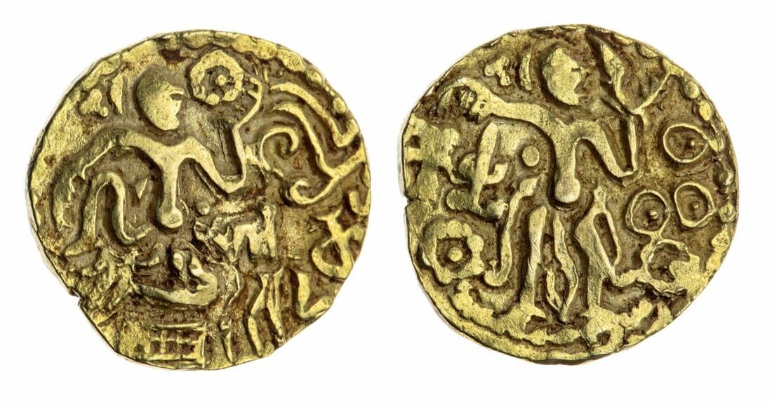 (x) Sri Lanka (Ceylon), Anonymous (c.960-1214), gold Kahavanu, 4.37g, type II (4) conch or jasmine bud and lotus, standing figure of Ceylon style, palm tree and lamp stand under arm in left field, holding what appears to be a conch (Codrington describes as a 'jessamine bud) right, three annulets below right, beneath feet a line connecting two open flowers, rev. figure seated right on an asana (low throne), holding an open lotus, Devanagari legend in right field Sri Lamka Vibhu (fortunate lord of Sri Lanka) (Codrington 50; Mitchiner, Southern India, part 2, -), some edge defects, about very fine, scarce