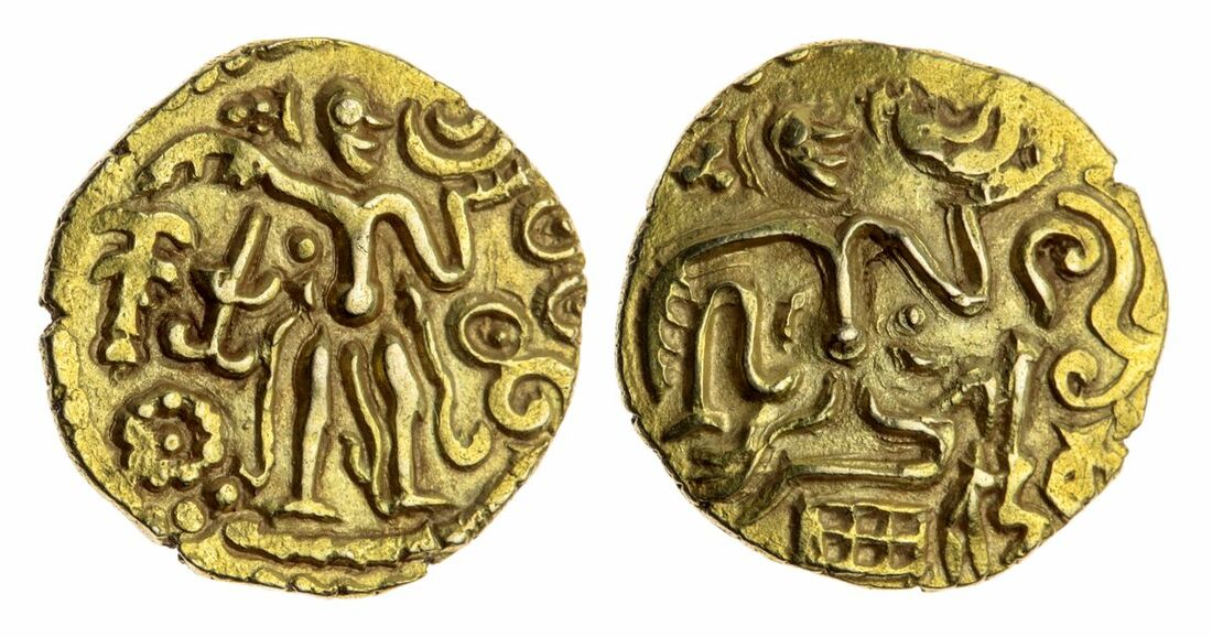 (x) Sri Lanka (Ceylon), Anonymous (c.960-1214), gold Kahavanu, 4.39g, type II (3), adahanda (half-moon) both sides, standing figure of Ceylon style, palm tree and lamp stand under arm in left field, holding adahanda right, three annulets below right, beneath feet a line connecting an open flower left and a conch right, rev. figure seated right on an asana (low throne), holding an adahanda (half-moon), Devanagari legend in right field Sri Lamka Vibhu (fortunate lord of Sri Lanka) (Codrington 49; Mitchiner, Southern India, part 2, -), a few light defects on edge, very fine, scarce