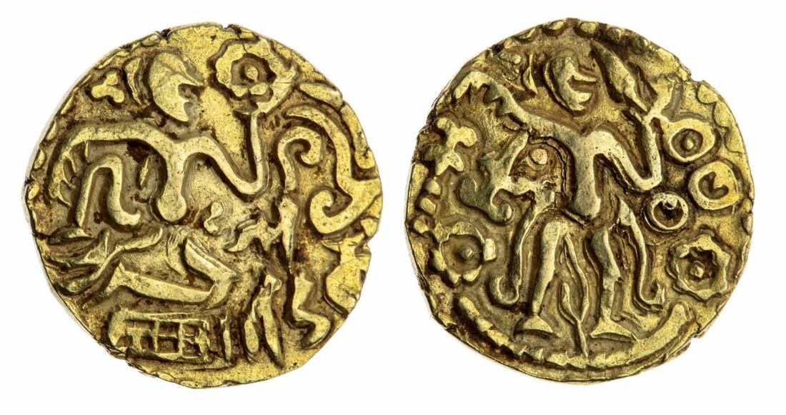 (x) Sri Lanka (Ceylon), Anonymous (c.960-1214), gold Kahavanu, 4.42g, type II (4), conch or jasmine bud and lotus, standing figure of Ceylon style, palm tree and lamp stand under arm in left field, holding what appears to be a conch (Codrington describes as a 'jessamine bud) right, three annulets below right, beneath feet a line connecting two open flowers, rev. figure seated right on an asana (low throne), holding an open lotus, Devanagari legend in right field Sri Lamka Vibhu (fortunate lord of Sri Lanka) (Codrington 50; Mitchiner, Southern India, part 2, -), some edge defects and filed areas, good very fine, scarce
