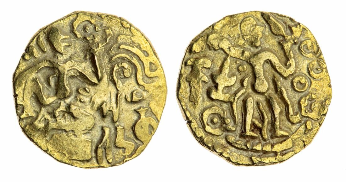 (x) Sri Lanka (Ceylon), Anonymous (c.960-1214), gold Kahavanu, 4.45g, type II (4), conch or jasmine bud and lotus, standing figure of Ceylon style, palm tree and lamp stand under arm in left field, holding what appears to be a conch (Codrington describes as a 'jessamine bud) right, three annulets below right, beneath feet a line connecting two open flowers, rev. figure seated right on an asana (low throne), holding an open lotus, Devanagari legend in right field Sri Lamka Vibhu (fortunate lord of Sri Lanka) (Codrington 50; Mitchiner, Southern India, part 2, -), some edge defects, about very fine, scarce
