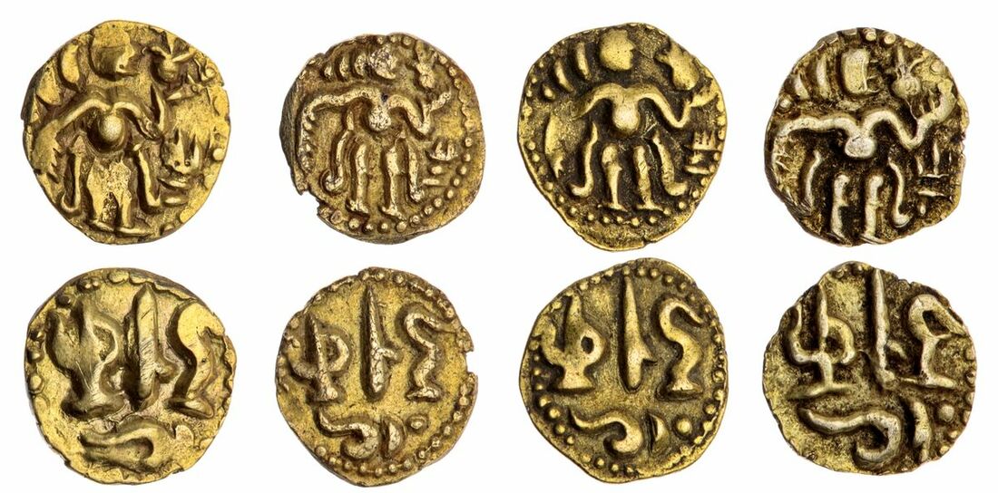 (x) Sri Lanka (Ceylon), Anonymous (c.960-1214), gold Aka, 0.52-.55g, (4), standing figure holding a jasmine flower (type III (B), rev. legend thought to read daraka in Devanagiri, all with a conch above, tail pointing right (Codrington 67-68; Mitchiner, Southern India, part 2, 315), average condition very fine or a little better, some die varieties (4)