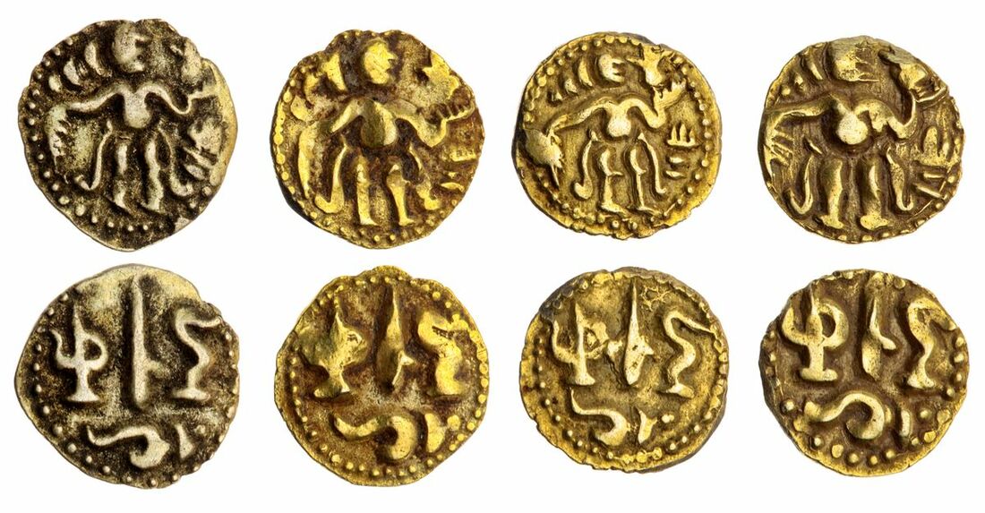 (x) Sri Lanka (Ceylon), Anonymous (c.960-1214), gold Aka, 0.51-.54g, (4), standing figure holding a jasmine flower (type III (B), rev. legend thought to read daraka in Devanagiri, all with a conch above, tail pointing right (Codrington 67-68; Mitchiner, Southern India, part 2, 315), average condition very fine or a little better, some die varieties (4)